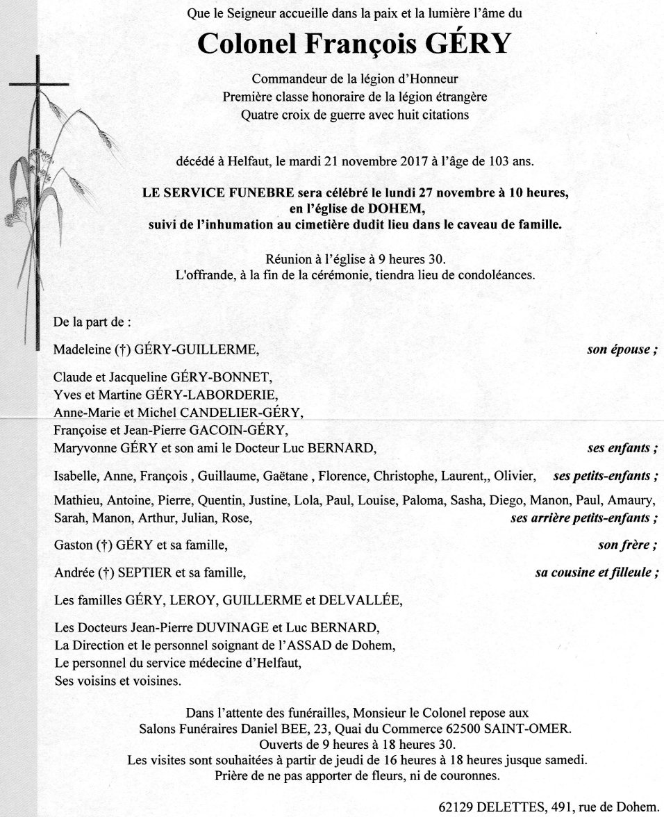 Faire_part_Colonel_GERY Publié 22/11/2017 à 2009 × 2472 dans Hommage au Colonel GERY François, 103 ans.. décédé.. ← Précédent Suivant → Partager : Cliquez pour partager sur Facebook(ouvre dans une nouvelle fenêtre) Facebook Cliquer pour partager sur X(ouvre dans une nouvelle fenêtre) X J’aime chargement…