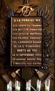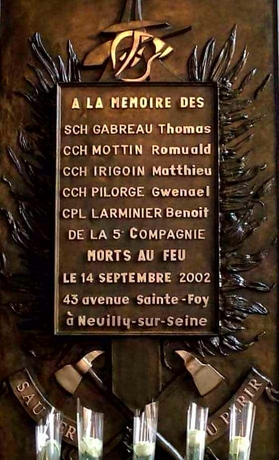 Neuilly -sur -seine, le 14 septembre 2002 , les pompiers de Champerret sont appelés pour un feu de chambre au sixième étage d’un immeuble qui en compte sept et se situe 43, avenue Sainte-Foy à Neuilly-sur-Seine. A 8h15, une première équipe grimpe les étages. Une épaisse fumée s’elève provenant d’une porte .. .rompus à ce type d’intervention les sapeurs-pompiers décident de la forcer. À l’ouverture, une boule de feu fond sur eux. À l’intérieur, en effet , un phénomène de combustion lente pouvant venir de la literie à provoqué une accumulation de gaz chaud .Une terrible explosion ébranle l’immeuble. L’appel d’air a modifié le mélange gaz air et l’exiguïté des lieux un couloir obscur, étroit de 60 cm, a amplifié ce phénomène que l’on appelle « flash over« . En un instant, la lutte contre un banal » feu de chambre de bonne », tourne au drame. Deux hommes tombent, victimes du devoir..