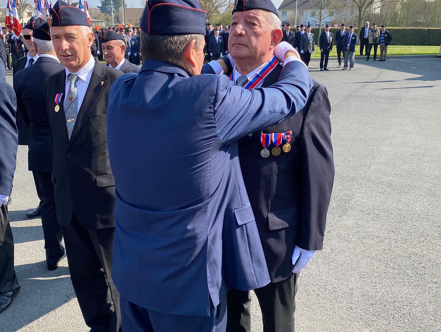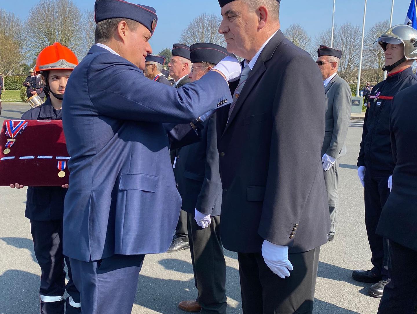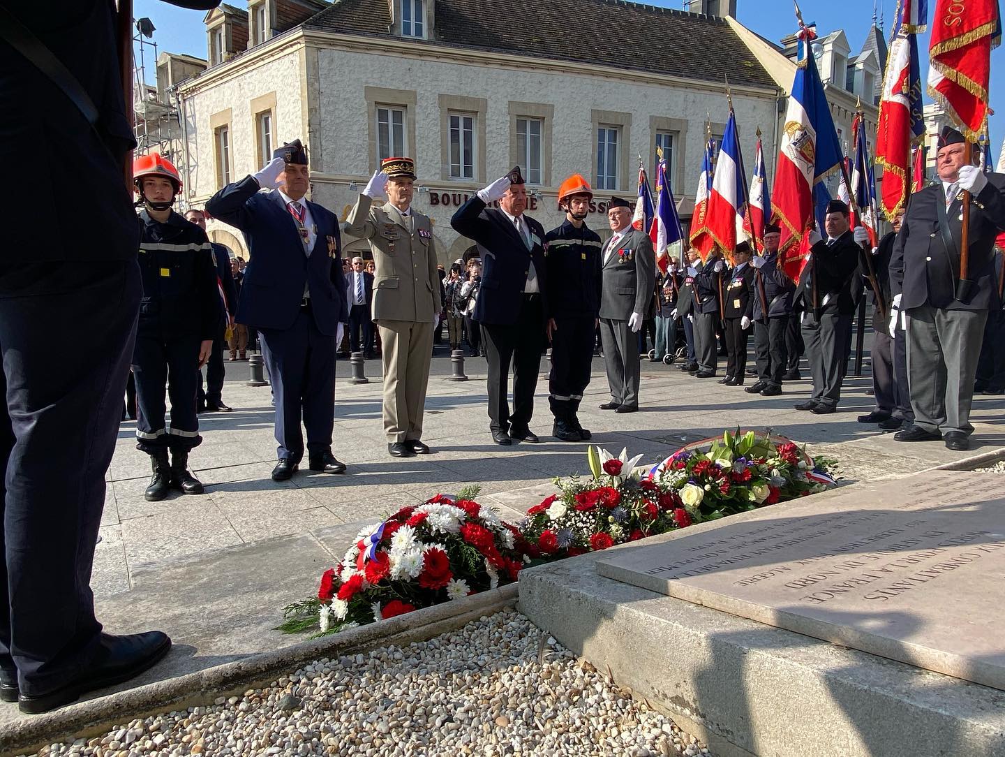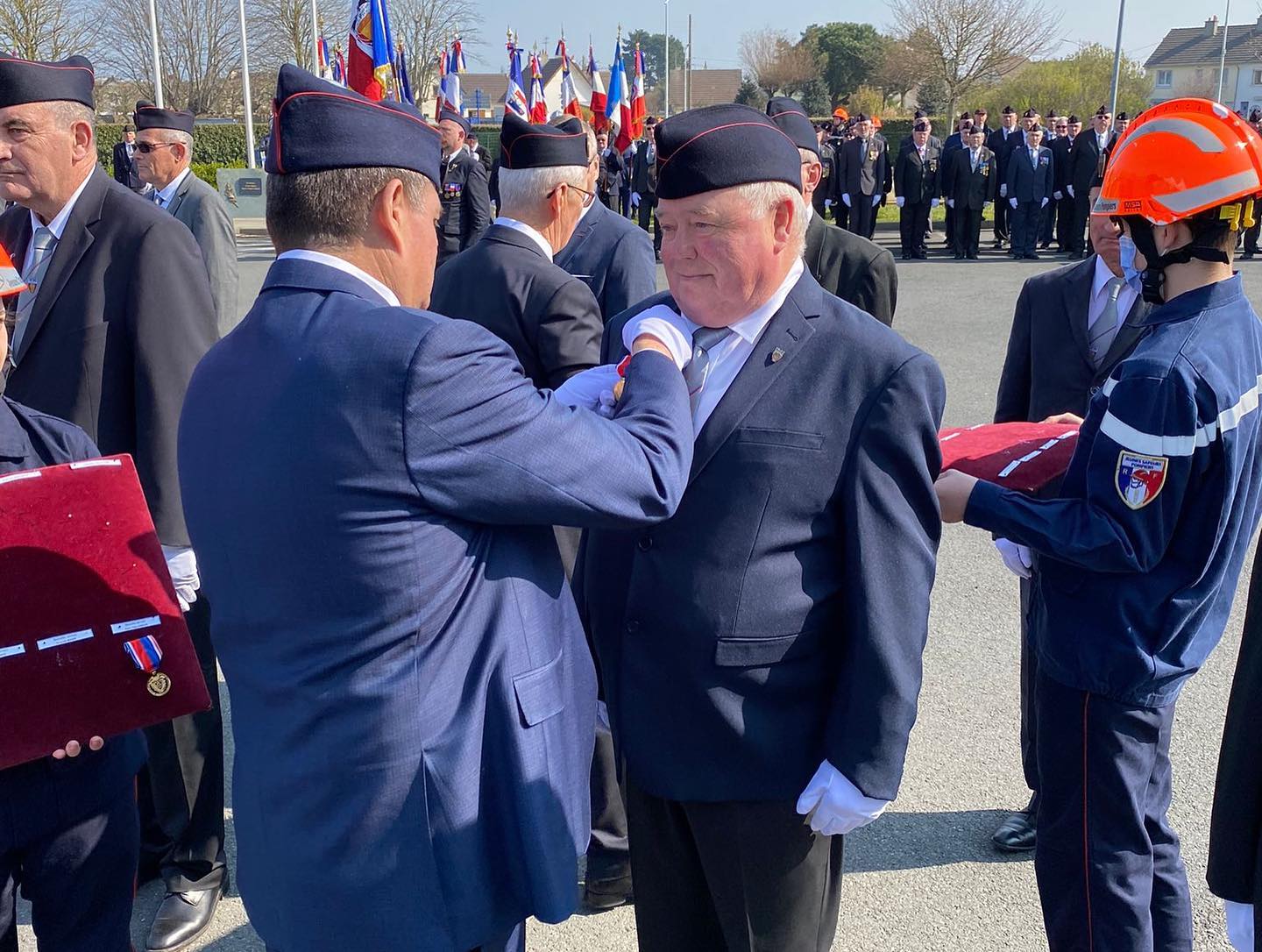 Puis un défilé, où 27 porte-drapeaux étaient présents, précédé de la musique des sapeurs-pompiers de Paris, s’est ensuite formé en compagnie ce magnifique retour de Printemps, pour se rendre au Centre de secours de OUISTREHAM, où s’est déroulée, en présence du public, sans oublier les JSP, une cérémonie officielle : dépôts de gerbes, appel des morts au feu.. notre Devoir de Mémoire et du Souvenir pour les pompiers décédés dans l’exercice de leur fonction… remises de distinctions pour de nombreux récipiendaires, discours et vin d’honneur. Ensuite retour à la salle ‘ Grange aux Dimes ‘ pour le repas officiel.