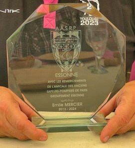 C est lors d’une réunion amicale entre amis que le Président Jean-Pierre LEBERT de l’AASPP Essonne, a eu le plaisir de remettre en remerciements des années passées au sein de notre bureau de 2013 à 2024 à Monsieur Emile MERCIER, qui vient de quitter notre belle amicale, «le trophée de l’amicale des anciens sapeurs pompiers de Paris de l’AASPP91 »