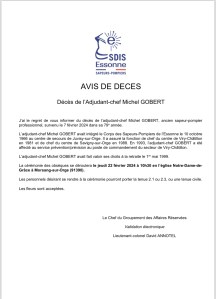 Nous avons le regret de vous informer du décès de notre ami Michel GOBERT, ancien Sapeur-pompier professionnel, survenu le 7 Février 2024. Monsieur Michel GOBERT était un membre actif de notre Amicale AASPP 91.